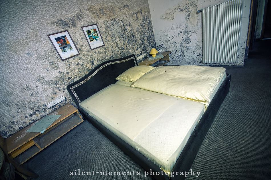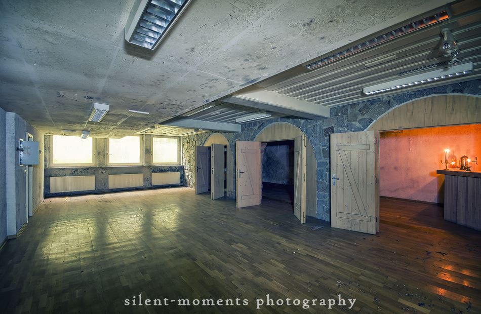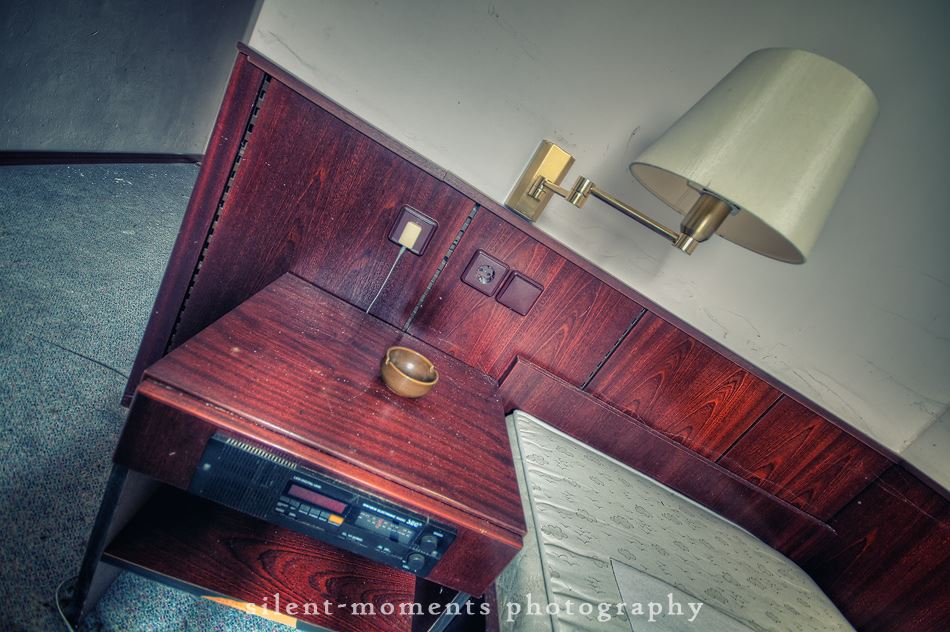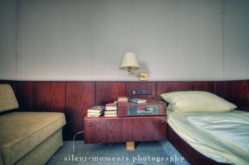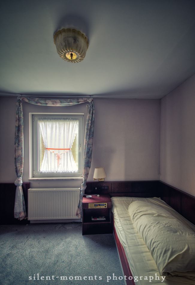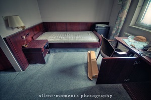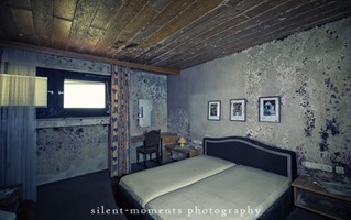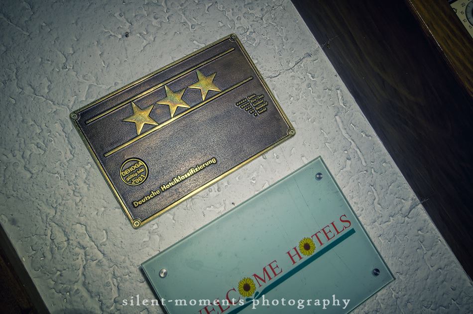 Als wir dieses Hotel betraten machte sich erst einmal die Ernüchterung breit. Die erste Etage war komplett entkernt aber dann kam die große Überraschung. Wir fanden auf der zweiten Etage möbilierte Zimmer vor, teilweise waren die Betten noch gemacht. Man hatte in dem Moment das Gefühl gleich checken neue Gäste ein. Auch im Erdgeschoß kein Vandalismus, dafür einen schönen Gastraum mit Tresen und Zapfanlage, die Küche noch komplett und im Keller einen Saunabereich. Aufgegeben wurde dieses Hotel 2005.