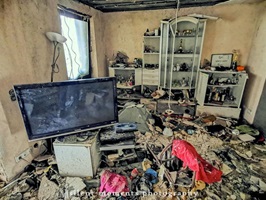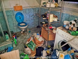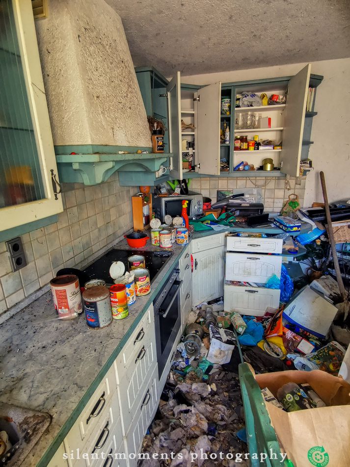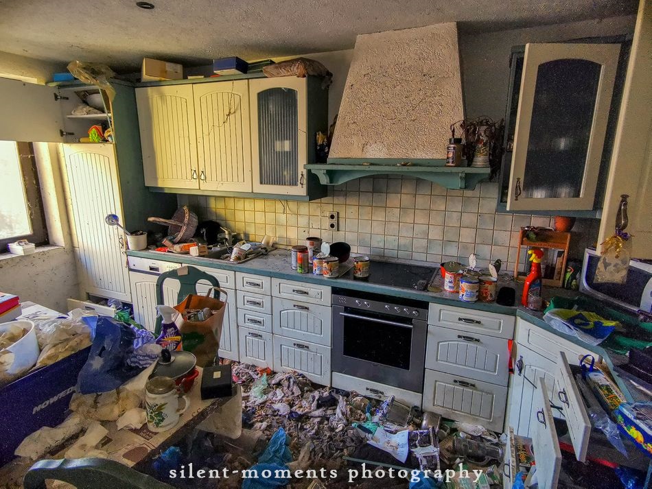 kleines Einfamilienhaus mit viel Müll, Feuchtigkeit und einen vollem Kühlschrank, aus dem man allerdings nichts mehr essen sollte.